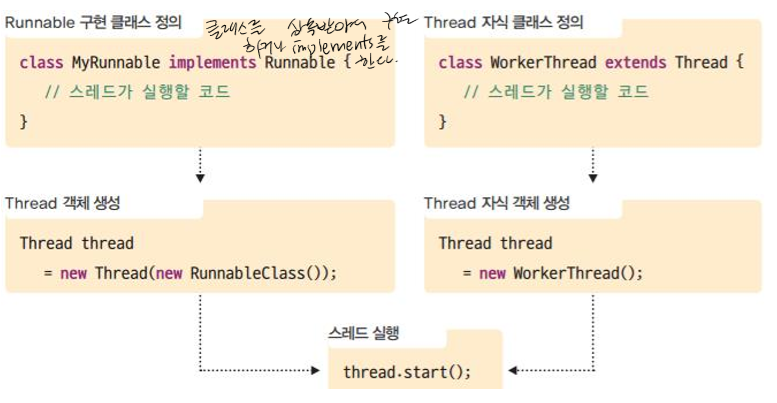 : 다수의 스레드로 실행하려면 runnable 인터페이스 또는 Thread 클래스를 상속하는 방법 두가지 중 하나로 작업
