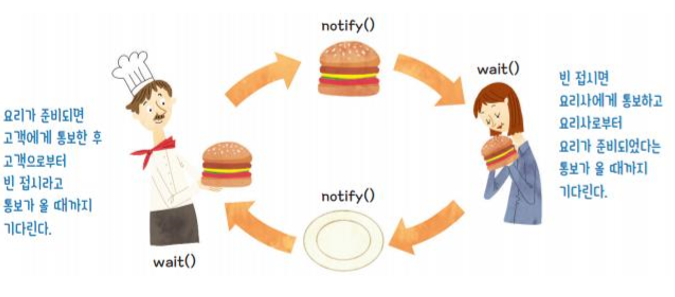 : 동기화 메소드와 블록을 이용하면 공유 자원은 보호할 수 있지만, 특정 스레드가 필요 없이 오랜 시간 동안 락을 걸수 있다. => object 클래스는 객체의 락과 관련된 wait(), notify(), notifyall() 메소드를 제공하여 이런 상황을 해결할 수 있다. (이 메소드들은 동기화 블록 안에서 사용해야 한다.)