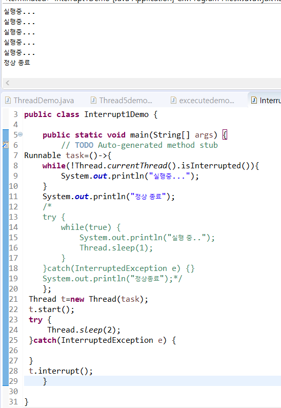 - 안전한 종료를 위해 반복문, interrupt() 메소드를 사용한다.
