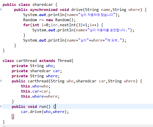 - 동기화 블록에 진입한 스레드가 락이 걸리고, 그 코드를 실행할 동안 다른 스레드는 동기화 블록 앞에서 락이 풀릴때까지 기다려야한다. / 고로 한 스레드 작업을 끝낼때까지 다른 스레드는 실행되지 못한다.