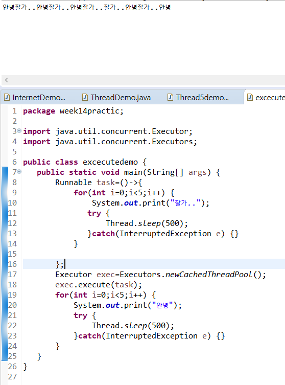 +) JDK 5부터 Excecutors 클래스를 포함하는 java.util.concurrent 패키지를 이용해 지원한다.