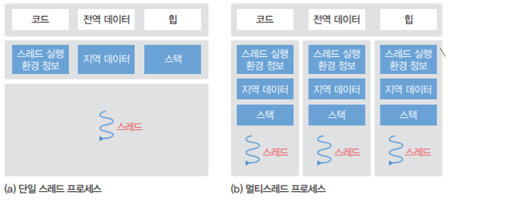 : 프로세스에 비해 실행 환경에 필요한 자원이 매우 적기 때문에 경량 프로세스라고 한다.