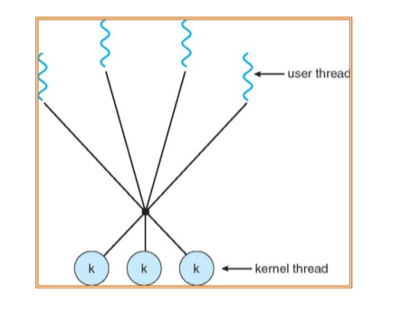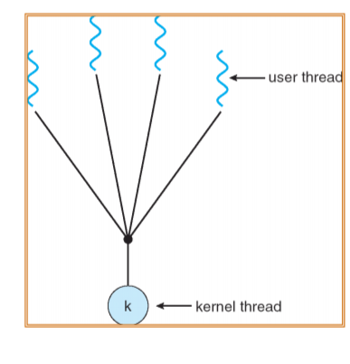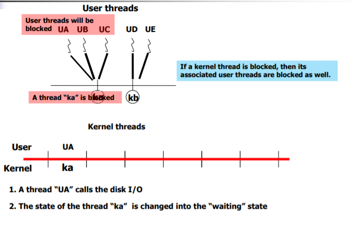 - 만약 user thread중 하나라도 disk i/o 등의 system call을 호출한다면, kernel thread가 disk io 했다고 간주하여 kernel thread 와 연관있는 모든 다른 user thread 또한 waiting 상태로 빠지게 된다.
