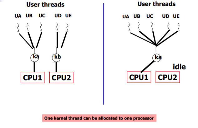 => 커널 스레드와 user thread가 매핑이 되어야지만 kernel이 수행중일 때 user thread가 실행 가능하다.