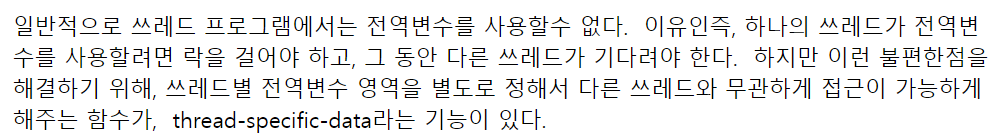 : 전역변수를 특정한 스레드에게 쓰고자 한다. -> 모든 스레드간에 공유가 가능하고, library에서 이와 같은 기능을 지원해줘야 쓸 수 있다,