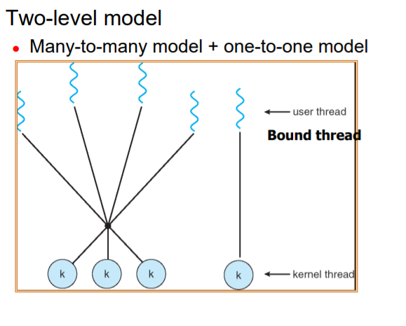 => One-to-one model ( kernel/user thread 생성 개수 제한) 과 many-to-one 모델( multi processing 효과 X) 을 병합한 hybrid model이라고 할 수 있다.