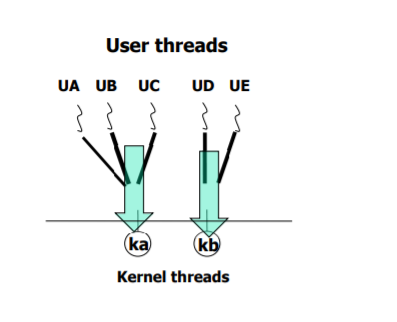 : 하나의 커널 스레드에 여러개 user thread가 매핑 된 경우이다. kernel thread가 생성될때는 상당히 overhead가 크지만,