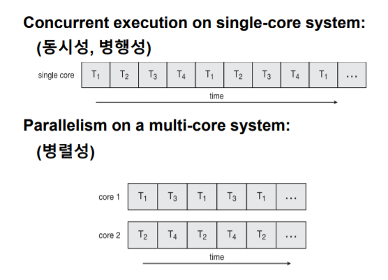 : 여러개의 스레드가 동시 수행 가능할때, 프로그래밍을 잘해야 여러개 코어를 효과적으로 이용 가능하다.